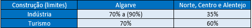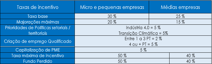 Nota: Na NUTS III Alto Alentejo, Beiras e Serra da Estrela, as taxas base são incrementadas em 10%. Para a NUT Alentejo e Algarve, a majoração de 5% na criação de emprego é para a criação de 2 ou mais postos de trabalho.